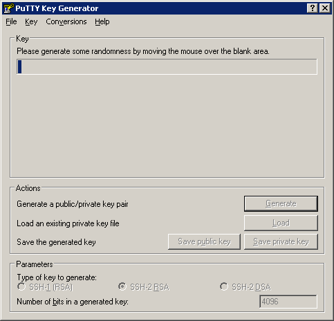 Click Generate, you will be asked to move your mouse around in the blank area to generate randomness. This uses mouse movement to ensure that completely random numbers are used to generate the key.