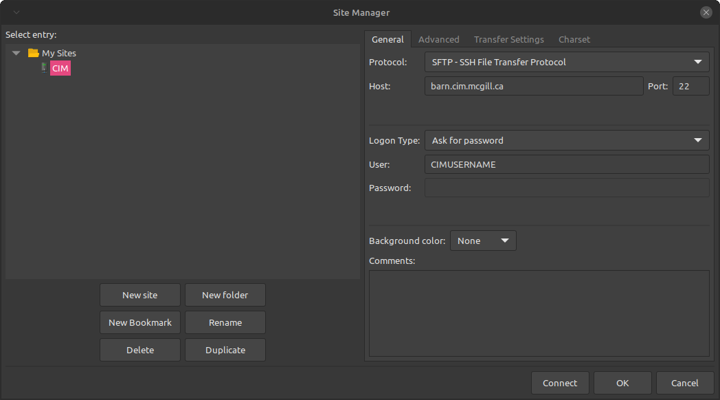 Set the protocol to SFTP, the host to barn.cim.mcgill.ca and set your username. You can then click Connect to connect to the CIM server. You will then be able to access and transfer files.